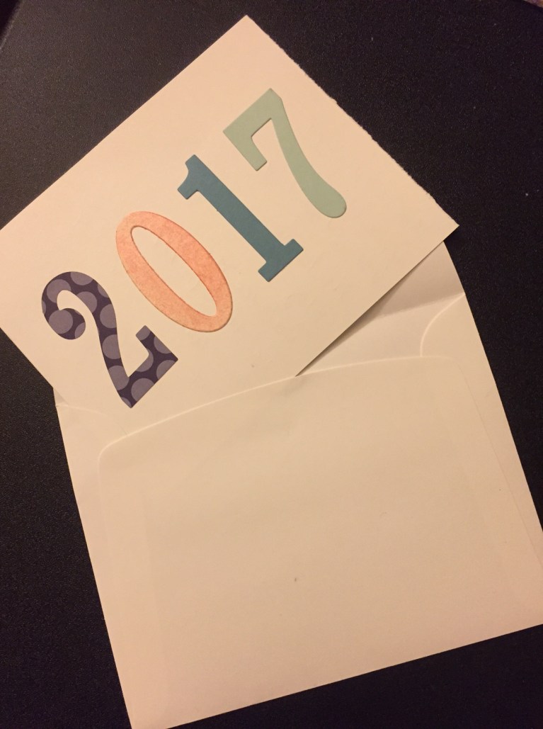 Sometime midway through 2016 my crazy English friend had made a comment that we should burn 2016 in effigy on New Year’s Eve. It’s been that kind of year so the idea stuck and we spent a quiet New Year’s Eve with my friend and her family. It was exactly what I needed. We had Chinese take out for dinner and played games. She presented each of us with a card that had 2016 on the front and 2017 on the back and these instructions: on the 2016 side write the things you didn’t like or wish didn’t happen, then write your goals on the 2017 side. We put the 2017 side into an envelope to hold until next New Year’s Eve. 2016 was burned in the fireplace along with a bit of sage.